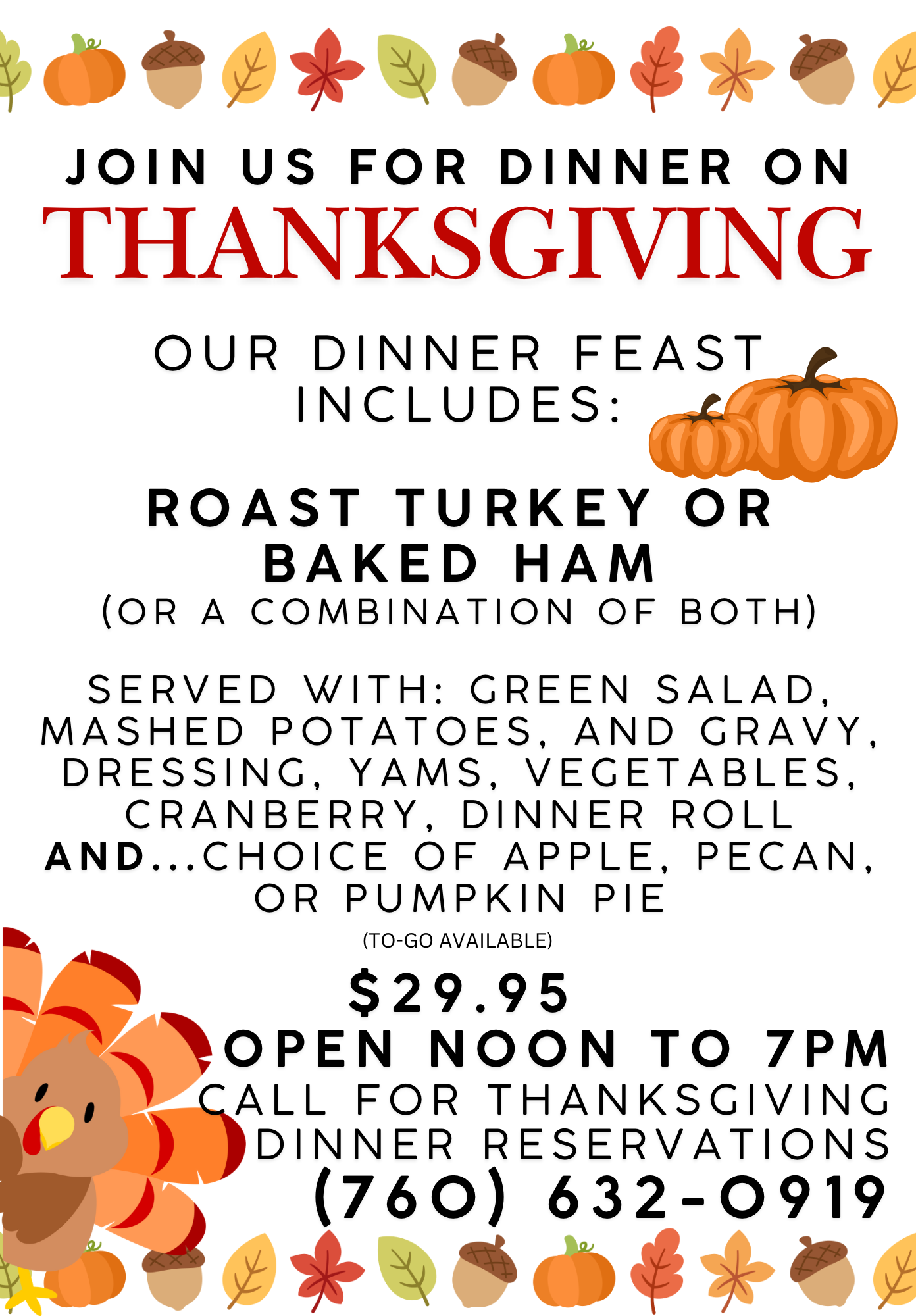 We offer a Thanksgiving dinner just like Grandma used to make. Come join us with the whole family on for a cozy family dining experience!